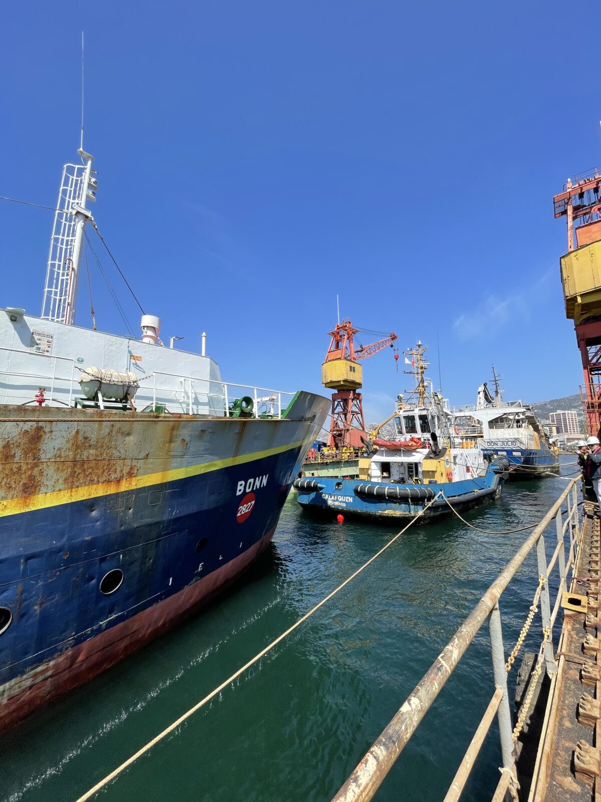 El pasado miércoles, nuestro dique flotante “Valparaíso III” recibió tres naves de manera simultánea: PAM DON JULIO, RAM CALAFQUÉN y PAM BONN, las cuales ingresaron para realizar sus trabajos de mantención y reparación.